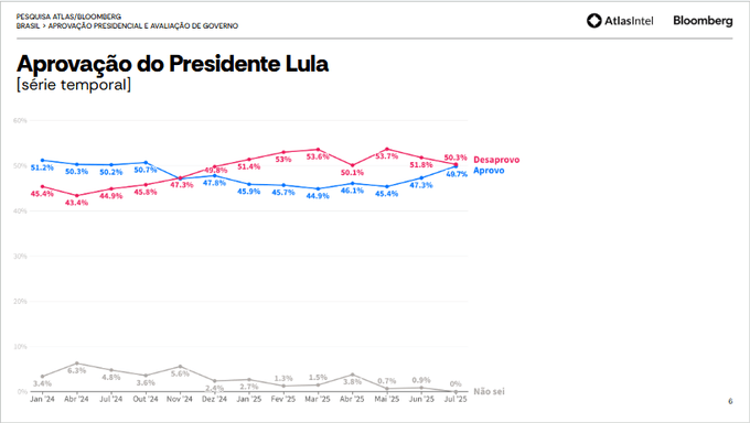 A aprovação do presidente Luiz Inácio Lula da Silva voltou a crescer e alcançou 49,7%, segundo nova pesquisa Atlas-Bloomberg divulgada nesta terça-feira (15). A desaprovação caiu para 50,3%, o que representa um empate técnico entre os dois índices e indica a continuidade da tendência de recuperação da imagem presidencial iniciada nos últimos meses. A sondagem mostra o maior nível de aprovação desde outubro de 2024, antes do período de queda.