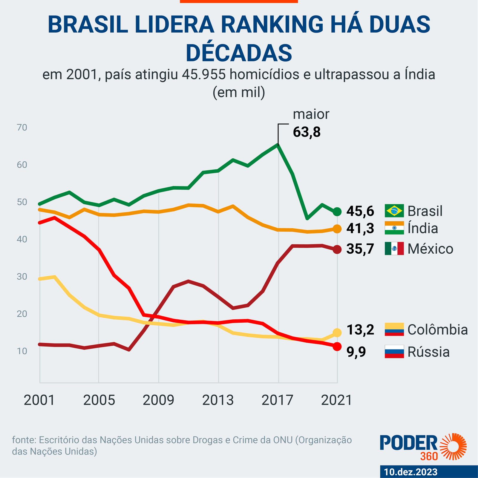 O país lidera o ranking das Nações Unidas desde 2001. Naquele ano, ultrapassou a Índia (2º colocado no geral) ao registrar 45.955 mortes por homicídios. Segue na 1ª posição até o último levantamento, com dados de 2021. México, Colômbia e Rússia fecham o top5.