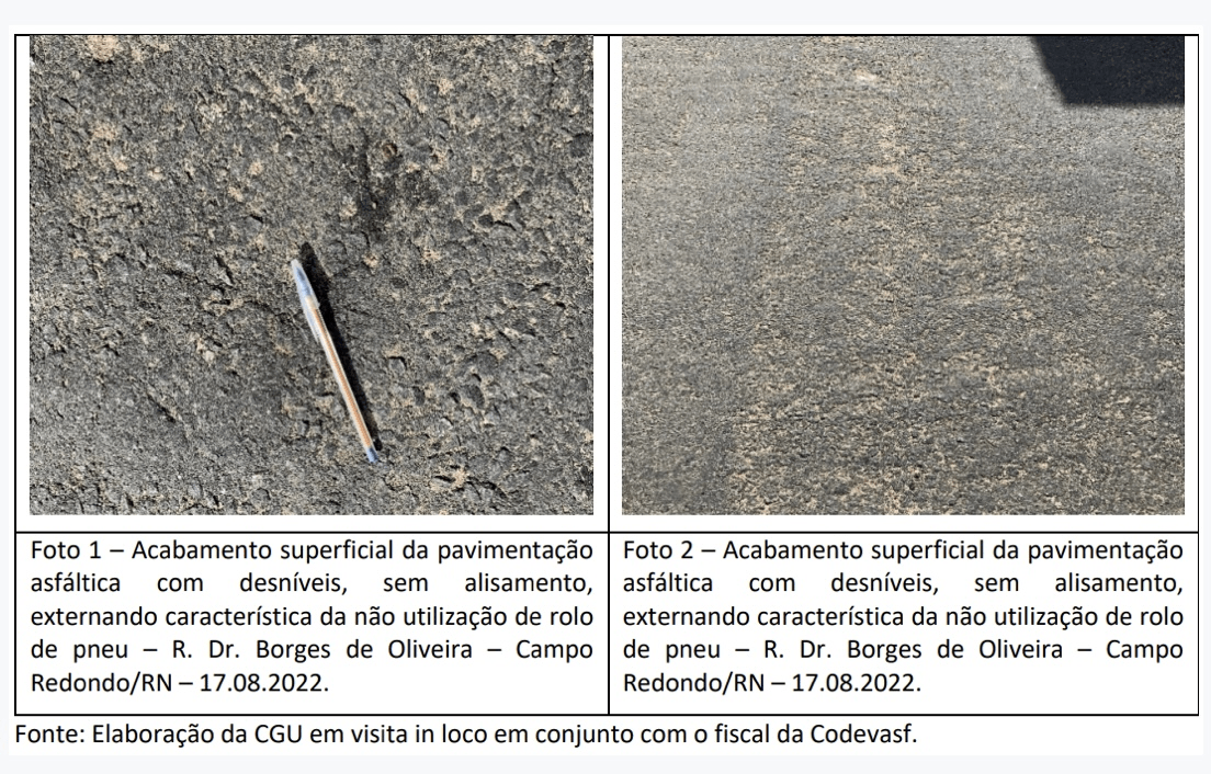 As medições feitas pela equipe da Controladoria apontaram que em determinados pontos do asfalto aplicado na rua XV de Novembro, no município de São Tomé, a espessura tem medidas de 2,5 cm, em outros pontos da mesma via, chegam a 3 cm, no entanto, ambas estão aquém do valor de 3,5cm previsto nos projetos executivos. Essa desconformidade afeta diretamente a qualidade do serviço, chegando, em alguns pontos, como na rua Dr. Borges de Oliveira, na cidade Campo Redondo, a revelar os contornos das pedras paralelepípedos que estão por baixo da camada asfáltica.