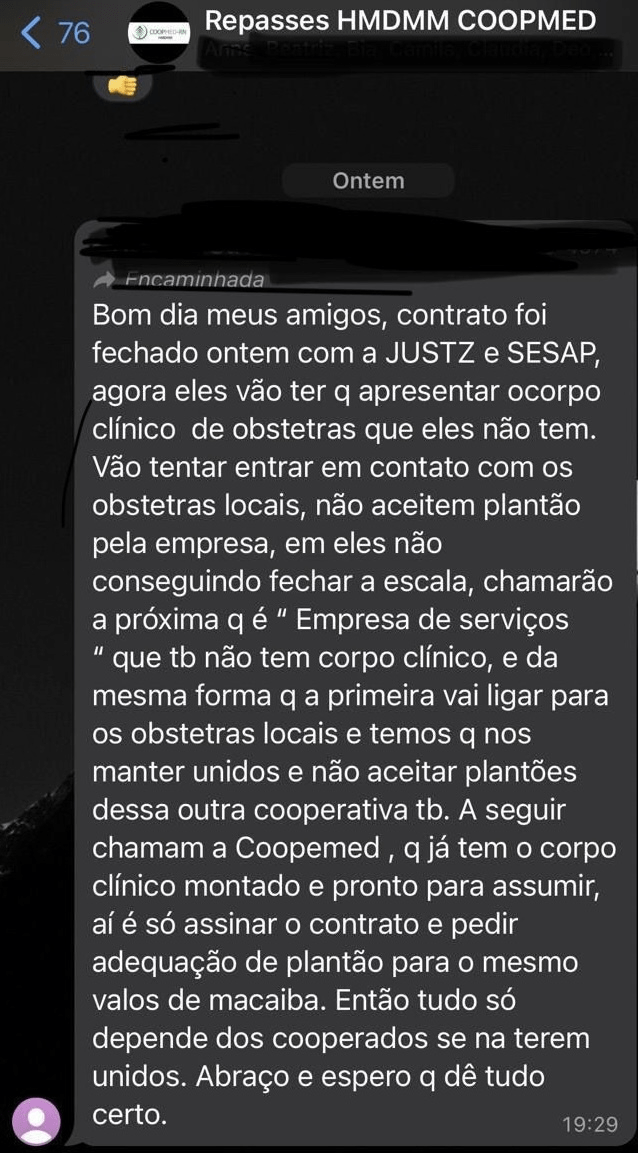 Circula em grupos de Whatsapp de médicos potiguares mensagens com teor de orientações aos obstetras que evitem fechar contrato para plantões na rede pública de saúde que não sejam vinculado à Cooperativa dos Médicos – COOPMED.