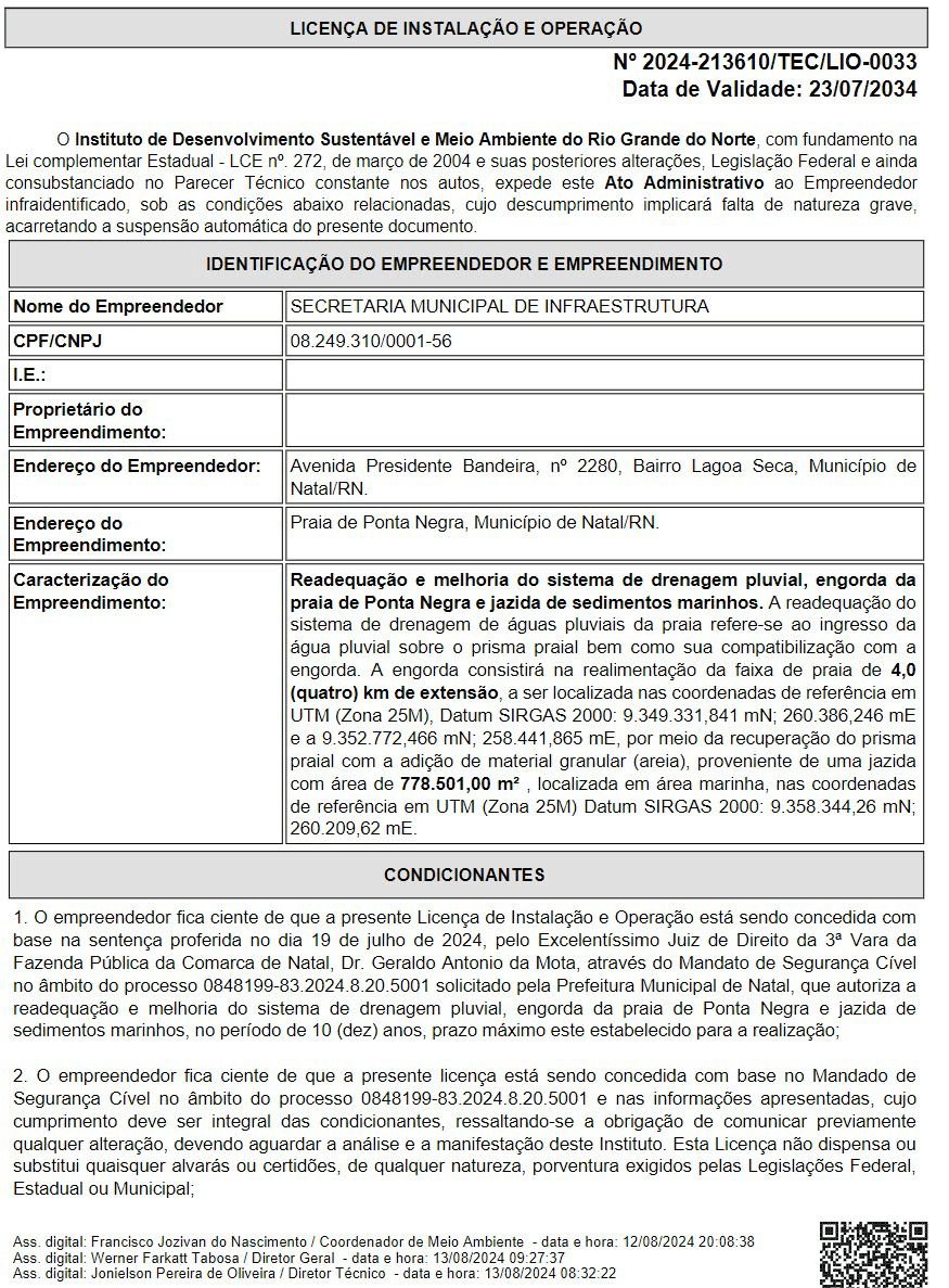 Foi emitido há poucos instantes um documento do Instituto do Desenvolvimento Sustentável e Meio Ambiente (Idema-RN) que concede a licença para o início da obra de engorda da praia de Ponta Negra.