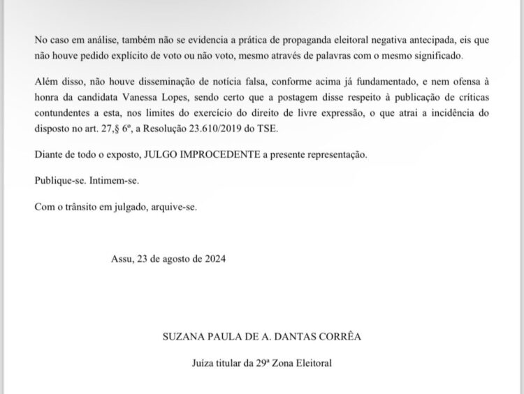 Na decisão, a juíza Suzana Paula Corrêa, da 29ª Zona Eleitoral, diz em trecho da sentença: ‘’Não houve disseminação de notícia falsa, nem ofensa à honra da candidata Vanessa Lopes, sendo certo que a postagem disse respeito à publicação de críticas contundentes a esta, nos limites do exercício do direito de livre expressão. Diante de todo o exposto, julgo improcedente a presente representação’’.
