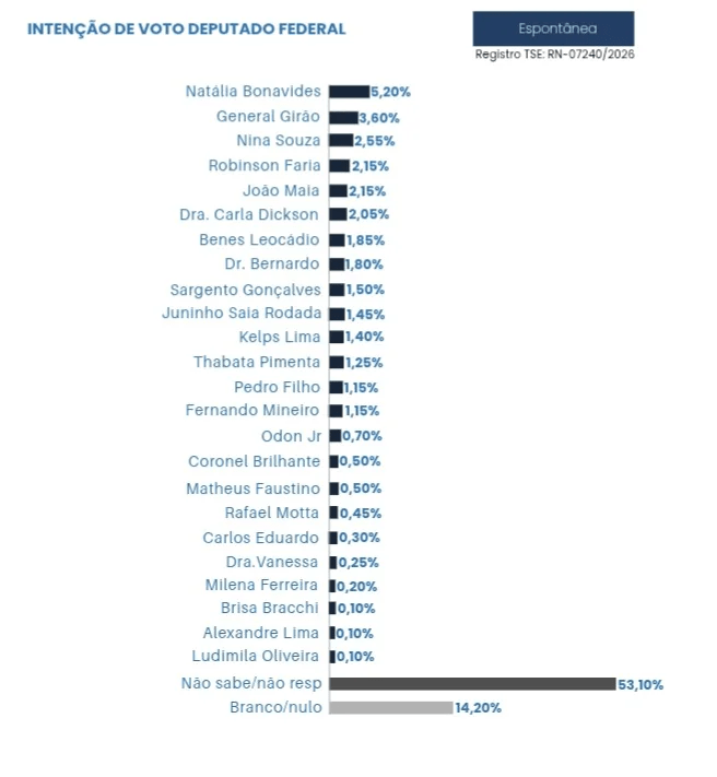 A pesquisa do instituto Media Inteligência, encomendada pelo jornal O Potengi, sobre a disputa pelas oito vagas do Rio Grande do Norte na Câmara dos Deputados mostra Natália Bonavides na liderança, com 5,20% das citações, seguida por General Girão, com 3,60%.