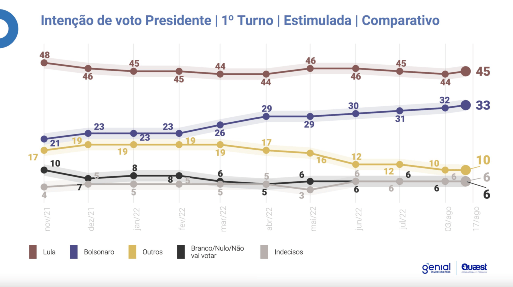 Pesquisa Genial/Quaest para as eleições presidenciais de 2022, divulgada nesta quarta-feira (17), traz o ex-presidente Luiz Inácio Lula da Silva (PT) à frente, com 45% das intenções de voto no primeiro turno, seguido pelo presidente Jair Bolsonaro (PL), com 33%. O primeiro turno das eleições está marcado para 2 de outubro.