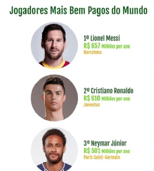 Ao comparar com o cenário mundial, o atleta brasileiro fica atrás somente do Cristiano Ronaldo com R$610 milhões, e do jogador mais bem pago do mundo, Lionel Messi com R$657 milhões.
