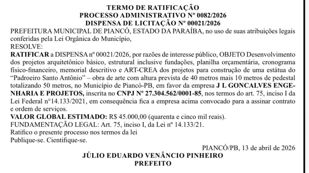 A Prefeitura de Piancó deu um passo formal para um projeto que já nasce com tamanho de cartão-postal. O município ratificou uma dispensa de licitação para contratar os projetos arquitetônico básico, estrutural, fundações, planilha orçamentária, cronograma físico-financeiro, memorial descritivo e ART-CREA de uma estátua de Santo Antônio com 40 metros de corpo mais 10 metros de pedestal, totalizando 50 metros de altura. O valor estimado desta etapa é de R$ 45 mil.
