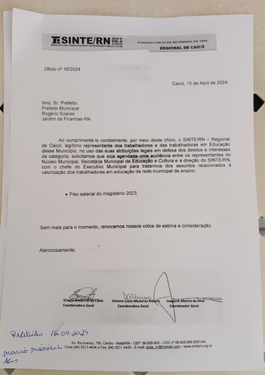 O prefeito se comprometeu, ainda no final do ano passado, que haveria uma reunião em abril para solucionar o problema. Contudo, além de não cumprir com a palavra, de pagar o que deve, voltou a ignorar os servidores. O Sindicato dos Trabalhadores em Educação Pública do RN (Sinte/RN) pediu audiência em 15 de abril para tratar do assunto, mas, até o momento, teve o silêncio como resposta.