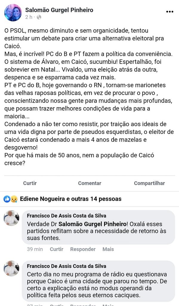 Depois do médico Salomão Gurgel, histórico líder da esquerda caicoense, declarar neste sábado (15) sua oposição à adesão do PT e PCdoB caicoenses ao projeto de Vivaldo Costa, agora foi a vez de Padre Costa, professor da UERN e primo do próprio Vivaldo, demonstrar contrariedade à iniciativa.