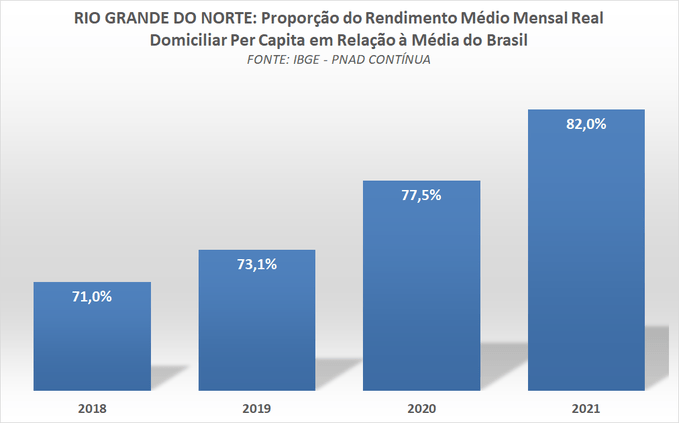 Aldemir lembra ainda que a proporção da renda média dos potiguares cresceu em relação à média nacional. “Um dado bastante interessante que demonstra os avanços que a gestão da governadora Fátima Bezerra trouxe para o RN. Em 2018 a renda mensal domiciliar per capita da população do RN era equivalente a 71% da média brasileira. Em 2021 subiu para 82%”, analisou.