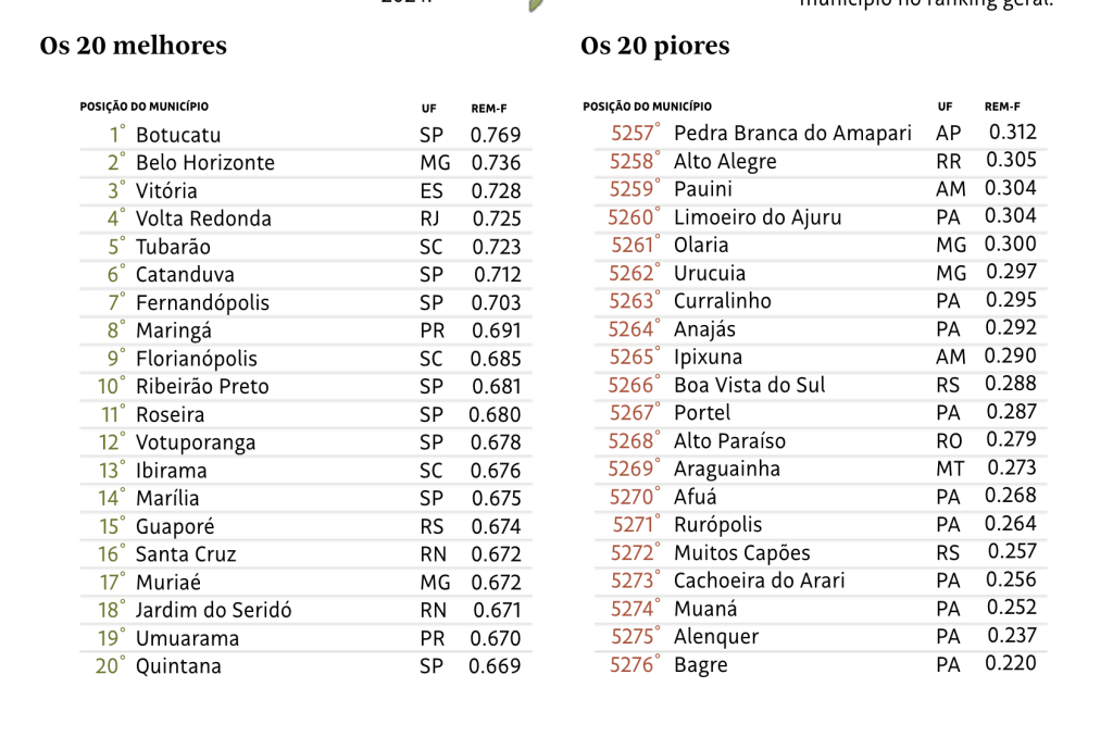 O REM – (Ranking de Eficiência dos Municípios) leva em conta o atendimento das prefeituras nas áreas de saúde, educação e saneamento. tendo como determinante no cálculo de eficiência da gestão a receita per capita de cada cidade.