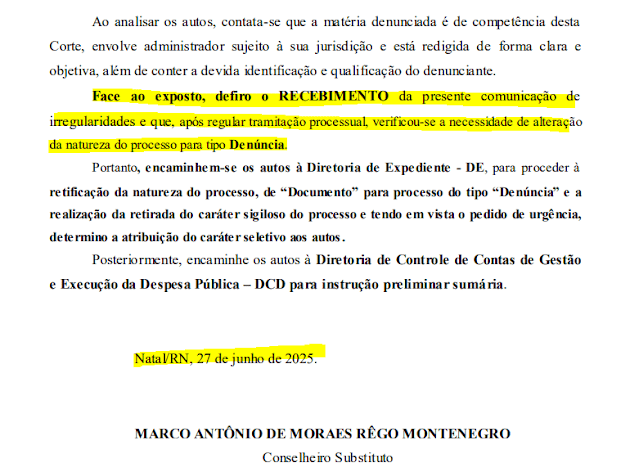 Em despacho publicado no dia 27 de junho de 2025, o conselheiro substituto Marco Antônio de Moraes Rêgo Montenegro determinou a retirada do sigilo do processo, o recebimento formal da denúncia e a mudança da natureza processual, com tramitação em caráter de urgência. O processo foi encaminhado à Diretoria de Controle de Contas de Gestão e Execução da Despesa Pública (DCD) para instrução preliminar.