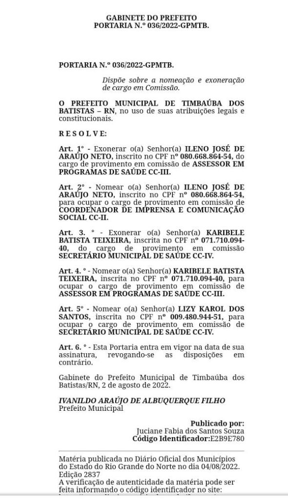 O Prefeito Ivanildo Filho (Ivanildinho), do município de Timbaúba dos Batistas, publicou várias mudanças no seu secretariado. As mudanças foram publicadas no Diário Oficial do município.