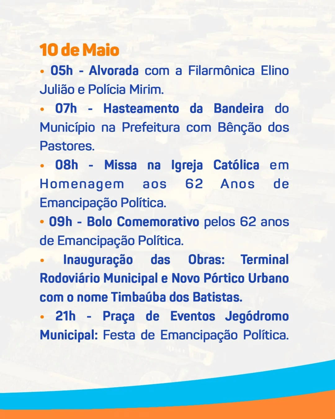 O município de Timbaúba dos Batistas se prepara para vivenciar a sua Semana Cultural com amostra de cinema, noite cultural, festa de Emancipação Política e outros acontecimentos importantes.